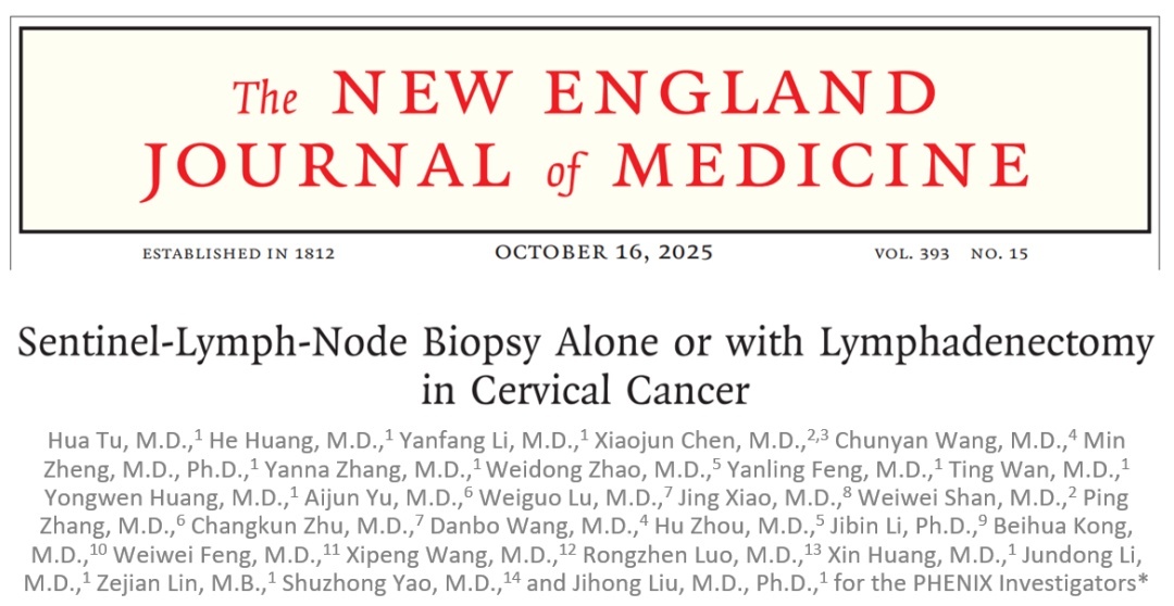 2025年10月16日,全球顶级医学期刊《新英格兰医学杂志》(The New England Journal of Medicine,NEJM)正式发表了中山大学肿瘤防治中心妇科刘继红、涂画团队的重磅研究成果——前哨淋巴结活检或联合淋巴结清扫治疗宫颈癌(点击文末阅读原文查看)。这项突破性研究有望重塑沿用一个世纪的宫颈癌手术标准高开网,开启精准手术治疗新纪元。
