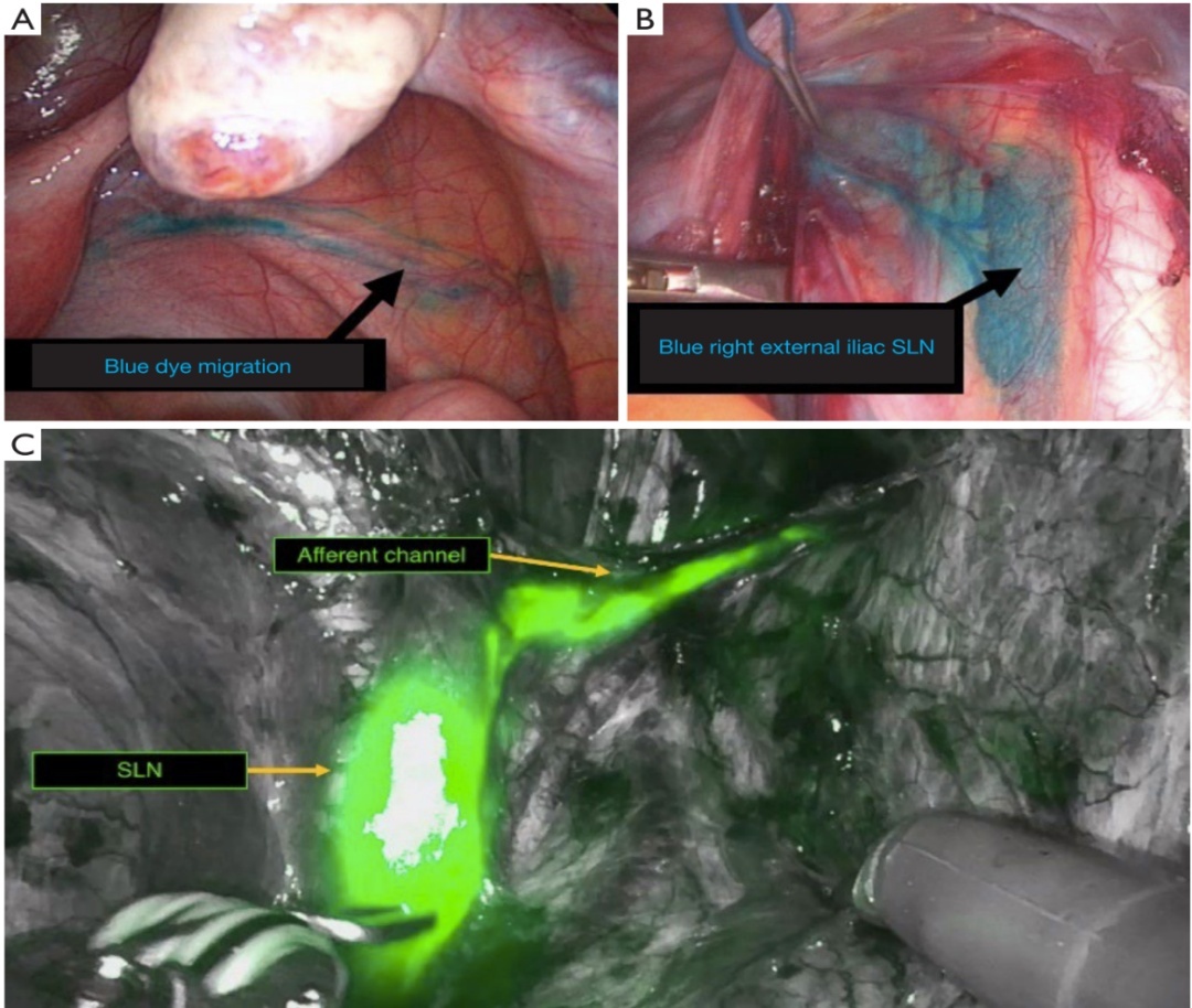 既往研究表明,宫颈癌的淋巴引流遵循固定的规律。能否利用这一规律,在保障治疗效果的同时,减小手术创伤?前哨淋巴结活检术是一种更为微创、精准的淋巴结评估方式,通过在肿瘤原发灶周围注射示踪剂,精准定位肿瘤引流区域的第一站淋巴结。对这些前哨淋巴结进行评估可让患者免除大范围的淋巴结清扫,从而减少创伤和并发症。
