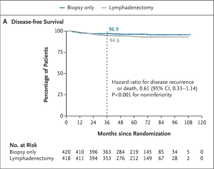 这项完全由临床医生发起的PHENIX研究历时十年,克服了多中心招募、质控标准化、长期随访、安全性监控、患者自报告数据追踪等诸多困难,共入组838例患者,中位随访期达62.8个月。结果显示,单纯前哨淋巴结活检组患者的3年无复发生存率与清扫组相似(96.9% vs 94.6%, 非劣效P值<0.001),前哨活检组淋巴结复发率显著低于清扫组(0 vs 2.2%)。此外,活检组的手术相关结局更优——手术时间更短、出血更少、术中并发症更少,术后远期并发症的发生率也显著降低。